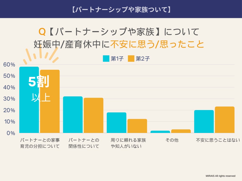 「パートナーシップや家族について妊娠中/育休中に不安に思う/思ったことについて教えてください(複数回答)」と質問したところ、第1子の産・育休者、第2子以降の産・育休者ともに5割以上が「パートナーとの家事育児の分担について」不安に思っていると回答しました。家事と育児を両立させるには、パートナーの協力が必要であると感じている回答者が多いことがうかがえます。