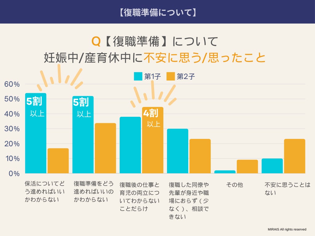 ●第1子の産・育休者は保活や復職準備の進め方に不安を感じ、第2子以降の産・育休者は復職後の仕事と育児の両立を不安に思っている