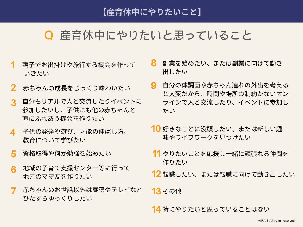 育休コミュニティ「MIRAIS」は産・育休者に対して意識調査を実施しました