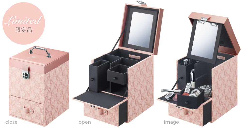 ポイントメイク、ベースメイク、スキンケアまで収納が可能なメイクアップボックス。ボックスはサテンとレースでロマンティックなイメージを演出し、ヴィンテージテイストのハンドルや留具でアクセントを添えました。外側はランジェリーピンク、内側はコスメを美しく見せるブラックのカラーリングとなっています。また、ご予約特典としてメイクアップボックスに取り付けられるチャームを付属。ご希望の方には名入れ(刻印)をいたします。