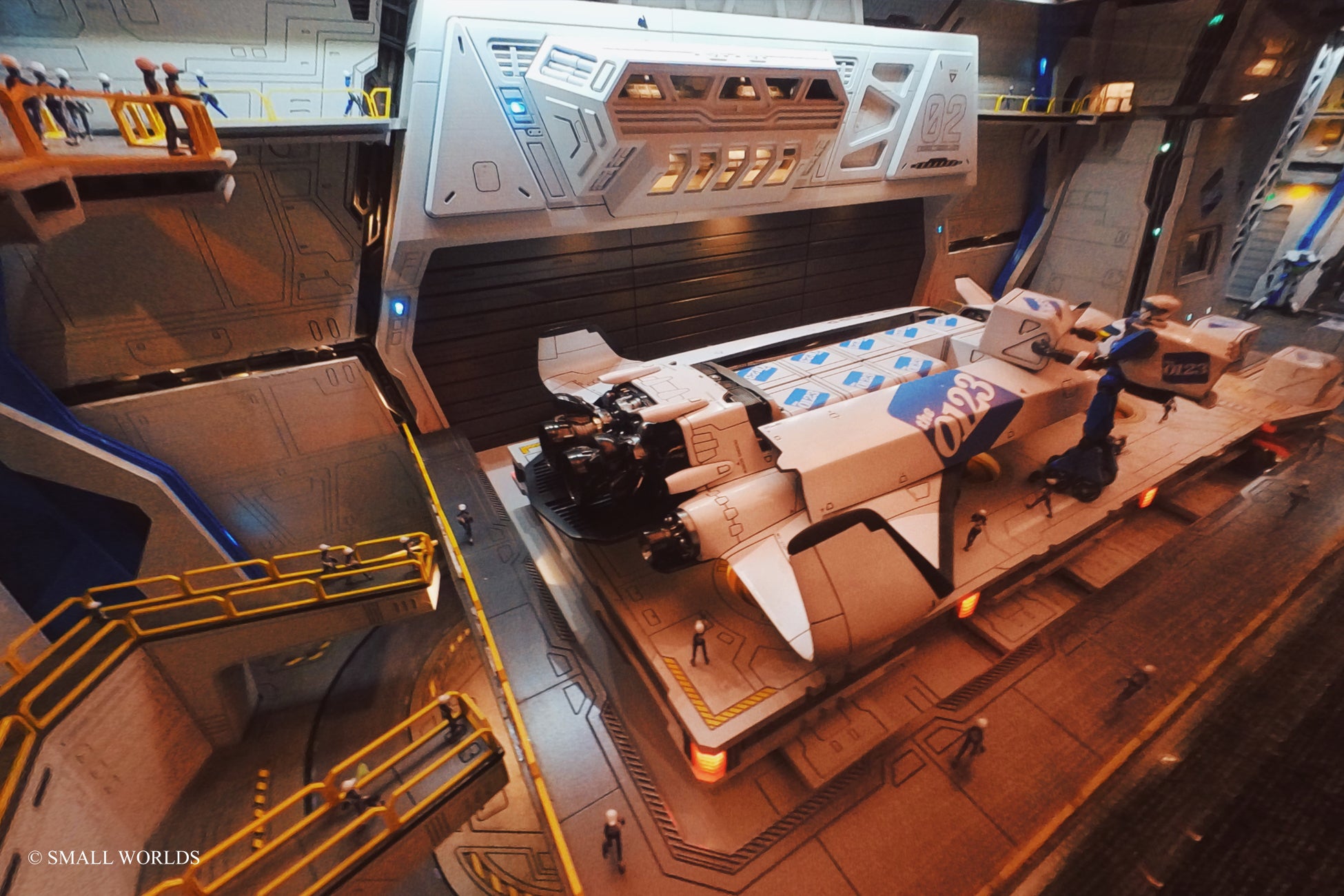 新しい宇宙空港は、スモワルのチーフクリエイティブ・オフィサーである河森正治の「こんな空港が将来できたら楽しい」を1/80サイズで形にした、今まで見たことがない空港です。カウントダウンとともに、白煙がもくもくと力強く立ち上がり目の前で打ち上がる未来のロケットは、1/80サイズとはいえ声を上げたくなるほどの大迫力です。非日常の感動を感じることができる、この打ち上げをぜひ間近でご覧ください。