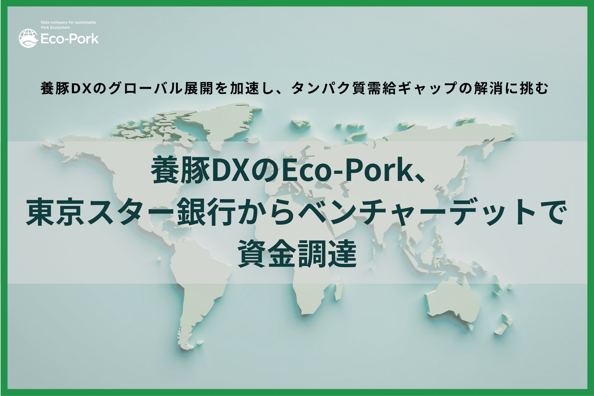 養豚における生産性と環境配慮の両立を支援するスタートアップ、株式会社Eco-Pork(本社:東京都、代表取締役:神林 隆、以下「当社」)は、株式会社東京スター銀行(本店:東京都、代表執行役頭取:伊東 武、以下「東京スター銀行」)からベンチャーデット(新株予約権付融資)による資金調達を実施したことをお知らせします。