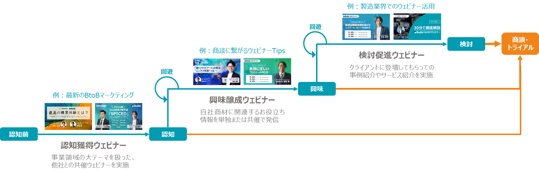 当社は、ウェビナーを単なる“リアルの代替手段”ではなく、新たなマーケティング手法として活用することを提唱し、企業のウェビナーマーケティングの戦略設計から企画、集客、実行、分析、改善まで伴走支援しています。しかし、1回のウェビナーのみで、認知から商談まで達することは難しく、目的に応じて段階的なステップを設計することが重要であると考えております。