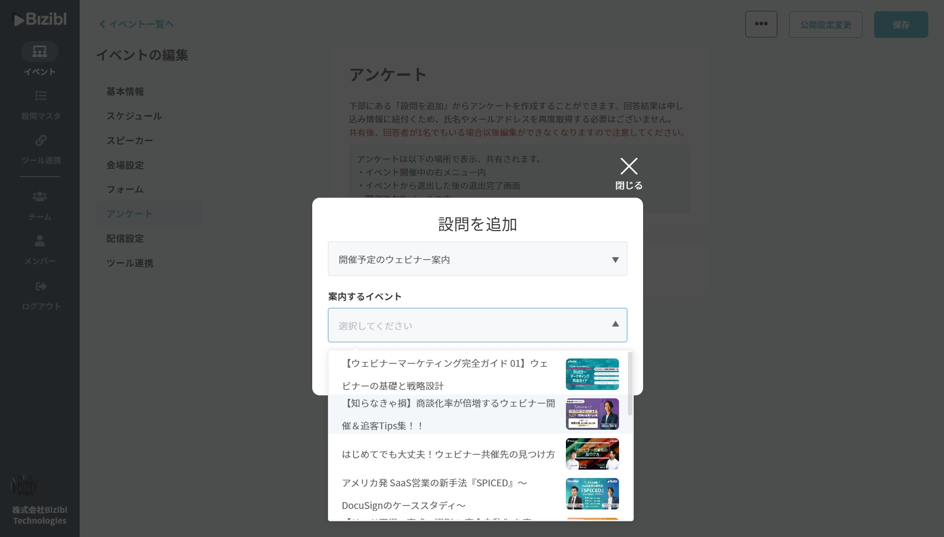 ・設定方法としては、参加者へのアンケート編集画面上に、あらかじめ設定した今後開催するウェビナーリストが自動で組み込まれ、表示するものを選択することで、簡単に追加ができます。