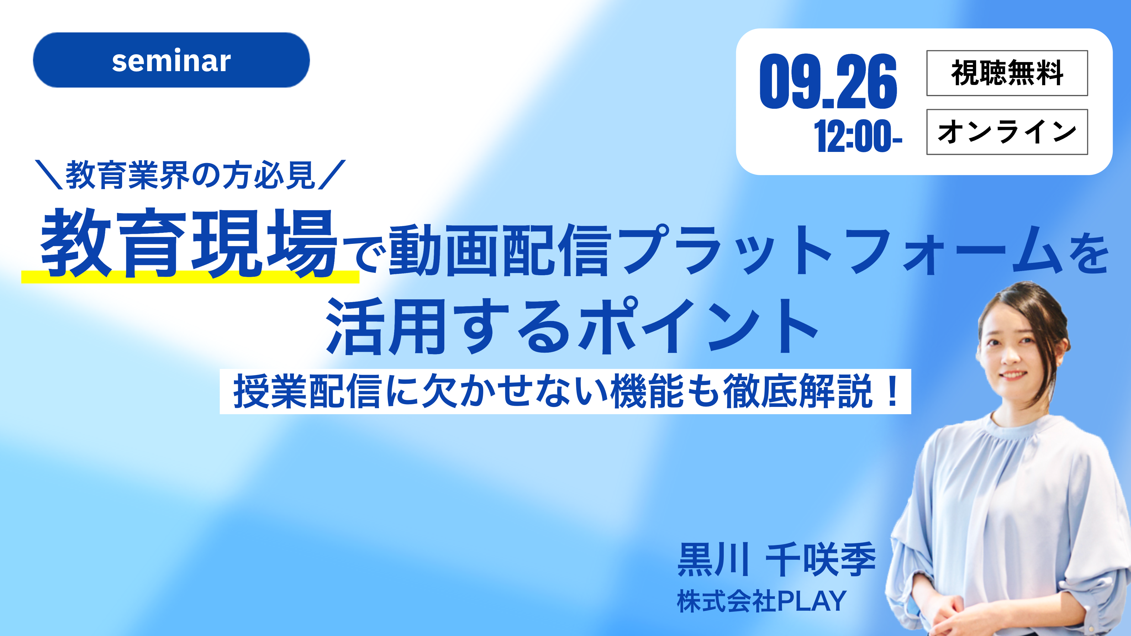この度株式会社PLAYは9月26日(火)12時〜「\教育業界の方必見!/教育現場で動画配信プラットフォームを活用するポイント」の申し込みページを公開しました。