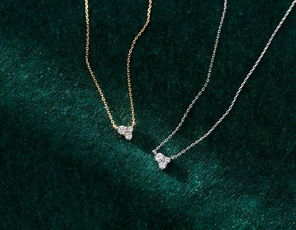 3石のラボグロウンダイヤモンドを逆三角形のような配置でセッティング。絶妙なバランスが、一粒タイプよりもすっきりとした印象を生み出します。他のネックレスと合わせれば華やぎのあるアクセントになります。