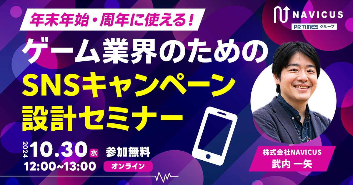 国内外のゲーム事業会社様のファンコミュニティ作りを、SNSを通じてご支援している株式会社NAVICUS(本社:東京都千代田区、代表取締役:武内 一矢、以下「NAVICUS」)が、ゲーム業界のマーケティング担当者やプロデューサーの方々を対象とした無料のウェビナー「年末年始・周年に使える!ゲーム業界のためのSNSキャンペーン設計セミナー」を2024年10月30日(水)に開催します。