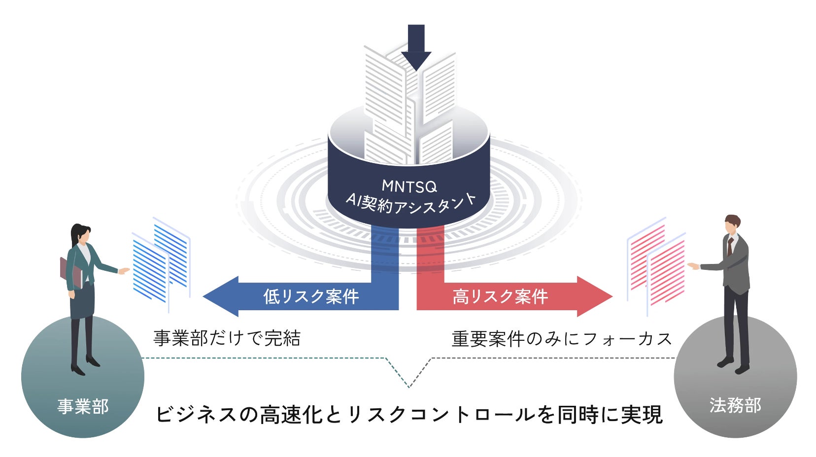 今回新たに導入いただく「MNTSQ AI契約アシスタント」は、AIを活用して低リスク案件を振り分け、高リスク案件のみを法務担当にエスカレーションすることができます。これにより、事業部門・法務部門双方において、低リスク案件に対する対処の効率化や省力化を実現すると同時に、高リスク案件をコントロールするために必要なリソースの拡充が可能です。