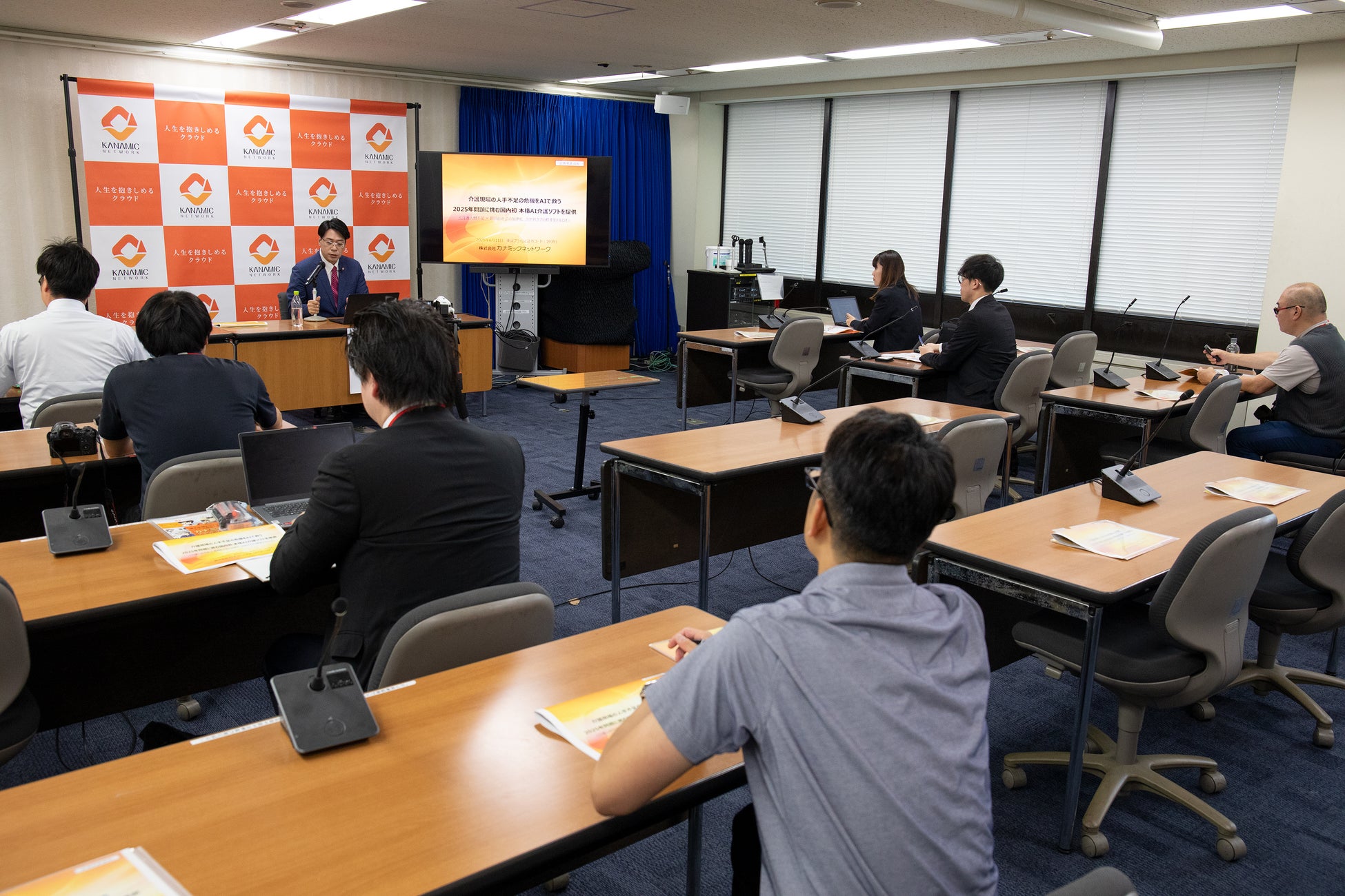 会見では、現在の介護現場が直面する課題とその背景、ならびに「カナミック介護AI-100Vision」による将来的な展望について、代表取締役社長の山本より詳しく説明が行われました。多数のメディア関係者にご出席いただき、活発な質疑応答も交わされました。