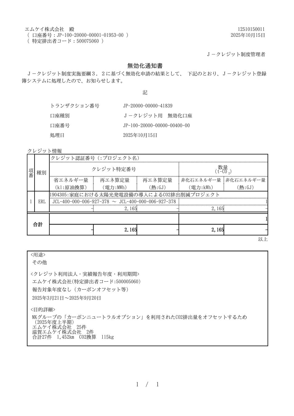 2025年度上半期は延べ27件、1,452kmで、CO2換算で115kg発生分をカーボンオフセットしました。内訳は京都MKが25件、滋賀MKが2件です。