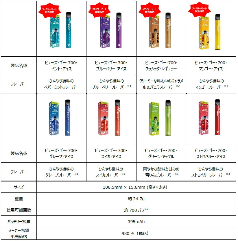 ファミリーマート販売銘柄は、全8銘柄のうち、「ビューズ・ゴー・700・ミント・アイス」、「ビューズ・ゴー・700・ブルーベリー・アイス」、「ビューズ・ゴー・700・クラシック・レギュラー」、「ビューズ・ゴー・700・マンゴー・アイス」の4銘柄です。ベイプの主要フレーバーであるミント系、フルーツ系、レギュラー系に対応する4種類を選定しており、好みの味わいを身近にご購入いただけるようになります。