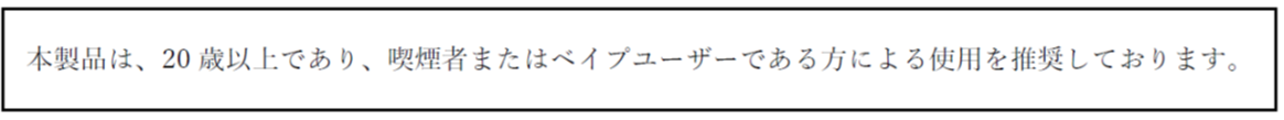 BATグループでは、たばこ製品のマーケティングを適切に実施するために国際的な自主規準を設定しています。そのためベイプ製品に関しても、弊社としては、責任あるマーケティング活動の精神に則り、本製品は20歳以上であり、喫煙者またはベイプユーザーである方による使用を推奨しております。記事掲載していただく際には、「注意文言」が表示されるようご配慮いただきたく存じます。 ご協力の程、何卒よろしくお願い申し上げます。