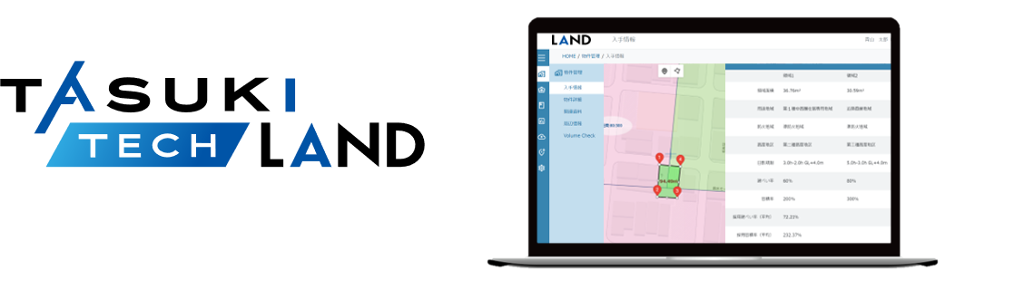 「TASUKI TECH LAND」は、これまで不動産業界内において、紙ベースによる管理が一般的だった土地所有者や仲介事業者から提供される土地・物件情報を、PCやスマートフォンからクラウド上で一元管理・運用ができるSaaS型サービスです。すべての仕入情報をクラウドで管理することで、業務効率化が可能です。