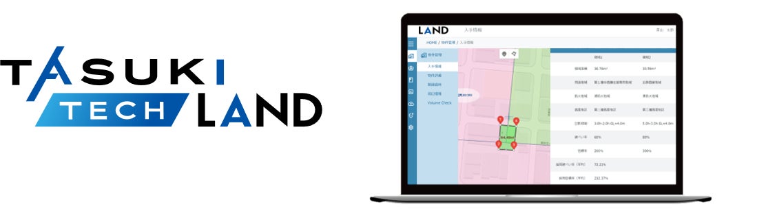 「TASUKI TECH LAND」には、最新の都市情報を自動学習するTASUKI TECH AIが活用されています。TASUKI TECH AIの学習データと独自の地理情報システム(GIS:Geographic Information System)によって、用地情報を入力するだけで、建ぺい率、容積率、日影規制などの都市情報が自動で地図上に表示されるため、スピーディーに事業用地の事業性の評価を行うことが可能です。