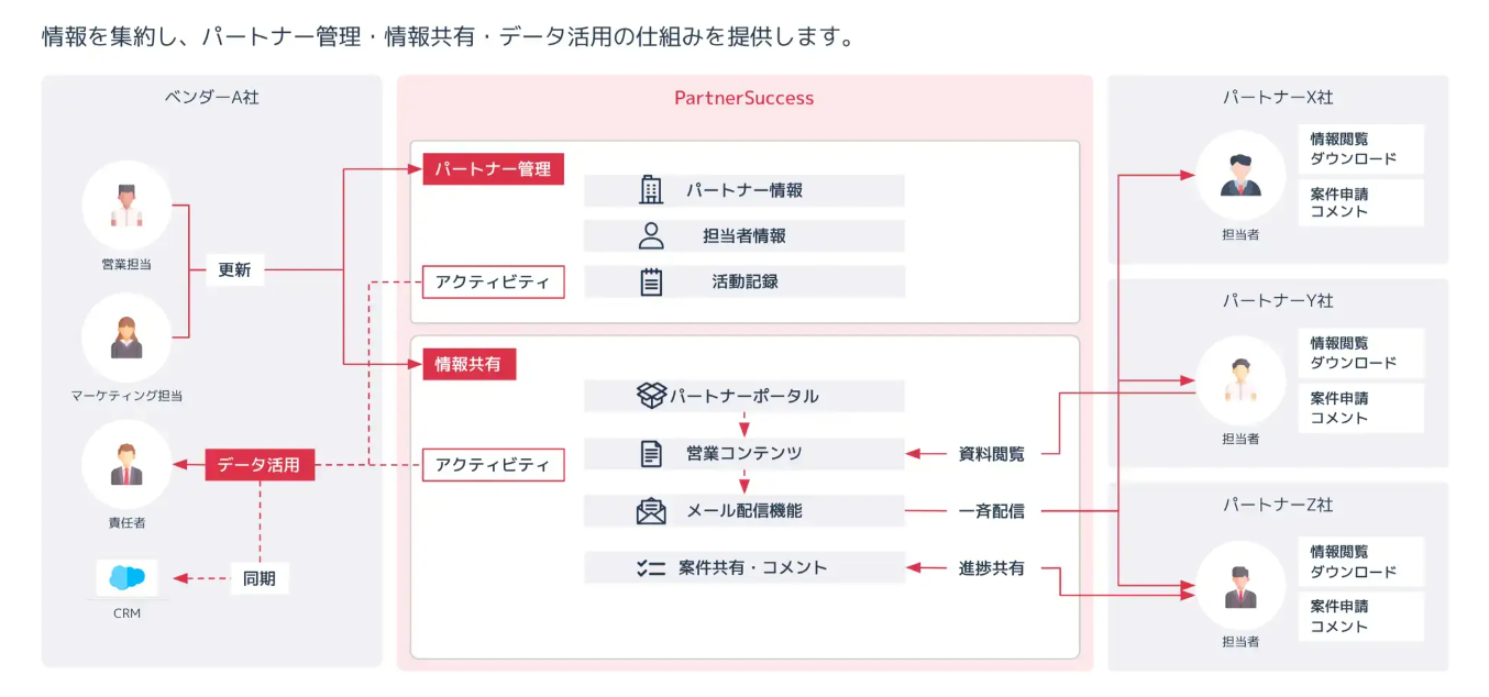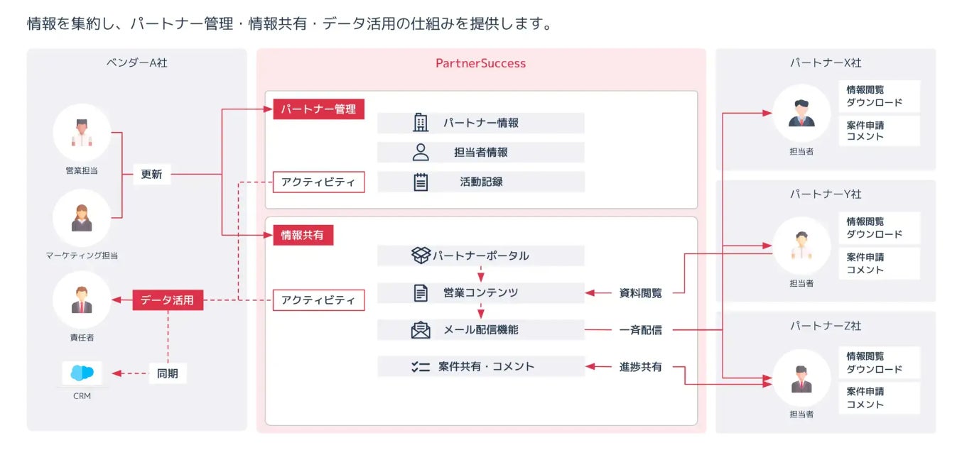 「PartnerSuccess」は、代理店管理・情報共有・データ活用の仕組みを構築し、代理店販売で業績を伸ばす、PRMクラウドサービスです。