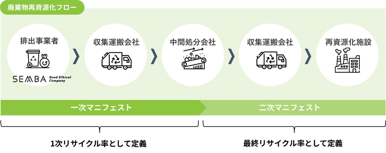 船場では、現場で出た全廃棄物量のうち、マニフェストの排出品目ごとに分別した割合を「1次リサイクル率」と定義しています。一般的に建設業界では「リサイクル率」は再資源化施設や最終処分会社の再資源化量をもとに算出される数値を指します。しかし、処理の過程で様々な場所から排出された廃棄物がまとめられ、その後素材ごとに異なる再資源化施設に運ばれることもあり、全ての最終処分会社での再資源化量を把握することが現段階では難しいため、船場では、現場での分別排出から一次マニフェスト(*4)の発行までを「1次リサイクル率」として算出しています。