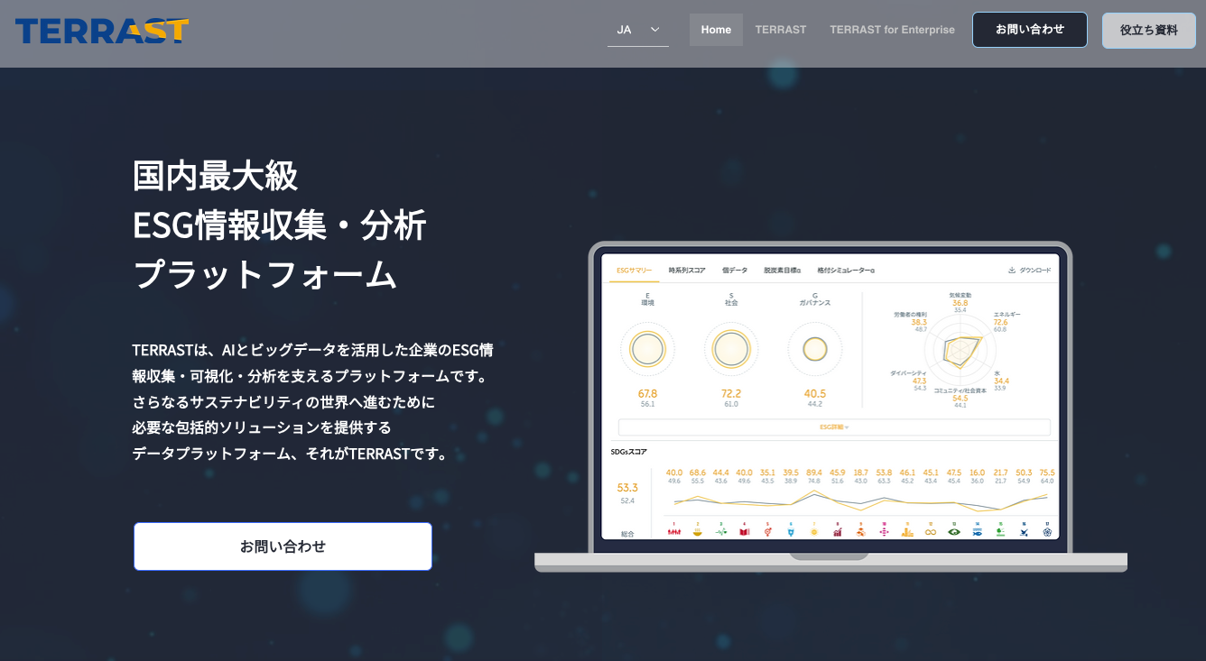 定性的に語られやすい企業の環境・社会貢献度をビッグデータとAIを用いて定量化する、国内最大級の非財務データプラットフォーム「TERRAST(テラスト)」や非財務・サステナビリティデータの開示・分析支援ツール「TERRAST for Enterprise」を開発・提供、サステナブル企業名鑑「テラスTV」を運営。非財務指標と財務指標の因果分析、相関分析も行い、データサイエンス × サステナビリティ × 金融工学領域の出身者による、ESG/SDGsに特化した非財務ビッグデータ集団として、社会・環境貢献と経済をシームレスに接続することを目指しています。日経グループによる「未来の市場をつくる100社(2023年版)」に選定。