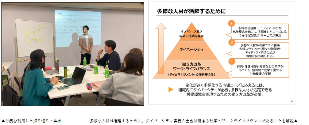 特に、振り返りタイムでは、大学生が考える仕事と私生活のバランスが企業等におけるワーク・ライフバランスと認識の齟齬があることや、健康面にも考慮する必要性、疑似企業内の職場メンバーのワーク・ライフバランスを実現することが仕事での成果につながることなど個々人の考え方や意見を考慮することが経営に効果をもたらすといったダイバーシティ経営の考え方について、講師であるワーク・ライフバランスコンサルタント・滝沢雄太から解説しました。