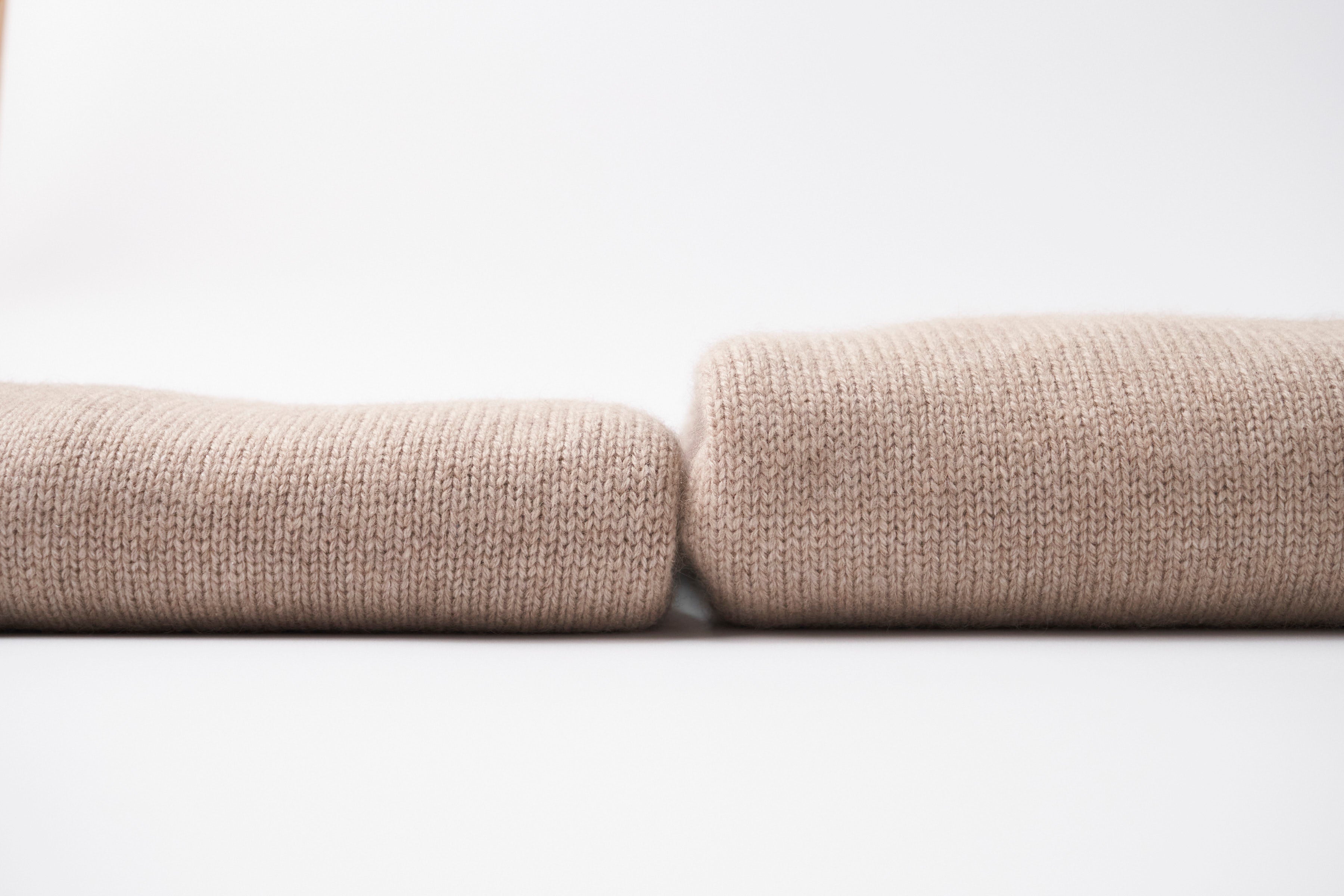 毛を柔らかくするための加工や編立後洗浄しないことで、「生カシミヤ」ならではの風合いと、着用による変化を楽しんでいただけます。