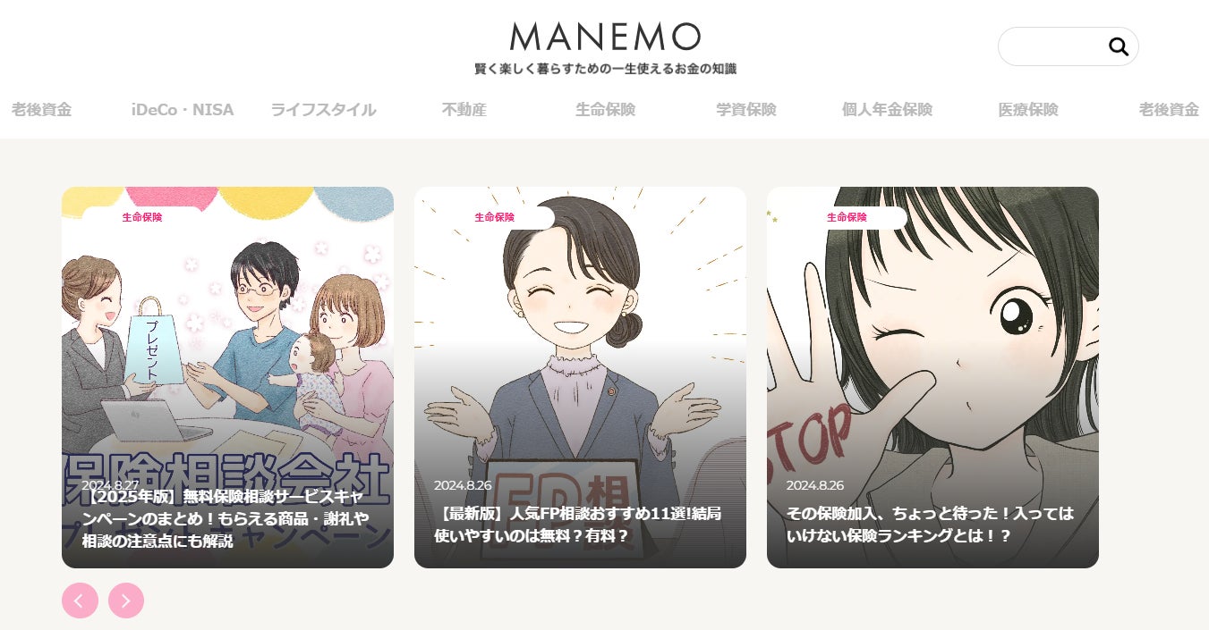 MANEMO(マネモ)では、iDeCo・NISAといった資産運用のやり方や生命保険や医療保険といった保険の話など「賢く楽しく暮らすための一生使えるお金の知識」をテーマに、わたしたちの日々の生活に関わるお金にまつわる様々な情報を発信しています。→https://www.41fp.com/media/