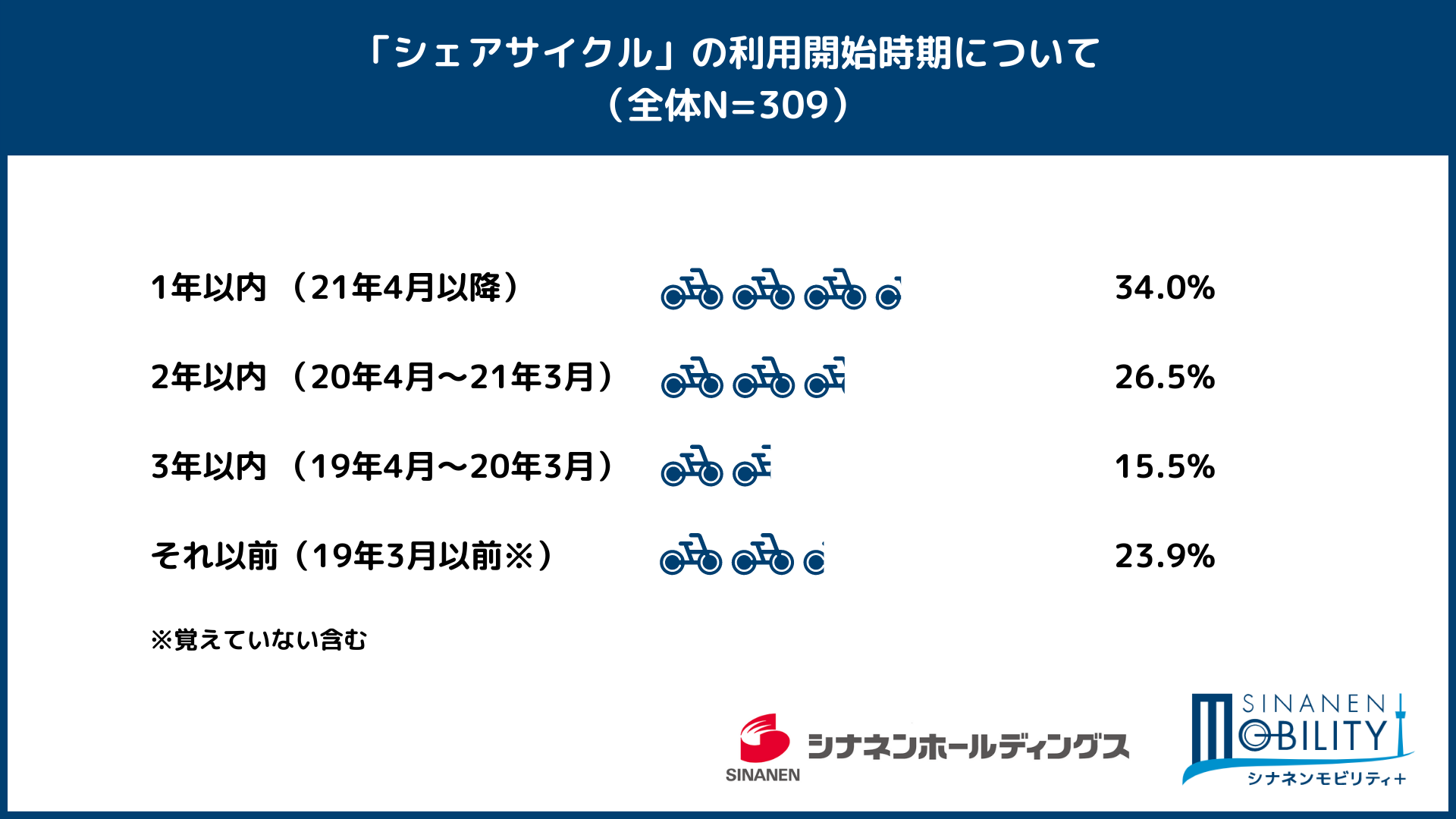 今回の調査は、東京都・神奈川県・埼玉県・千葉県に居住する15歳から69歳の、直近3か月以内にいずれかのシェアサイクルサービスを利用したことがあると回答した男女309名を対象に実施しております。