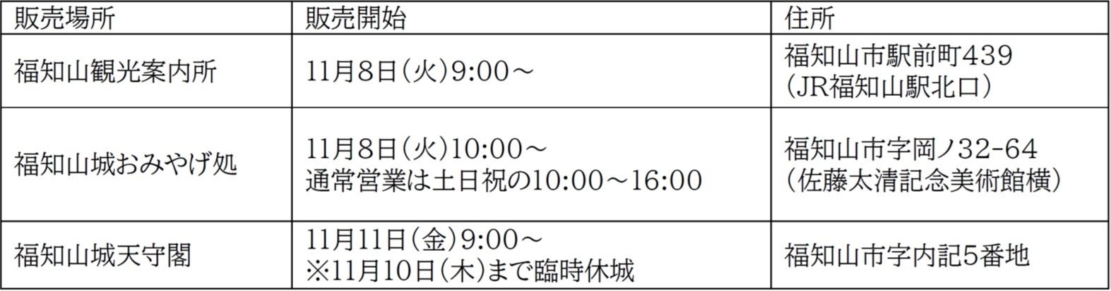 一般販売は、11月8日(火)9時から、福知山城おみやげ処と福知山観光案内所で行い、福知山城天守閣では、臨時休城明けの11月11日(金)9時から販売します。1枚1,500円(税込)、限定600枚です。