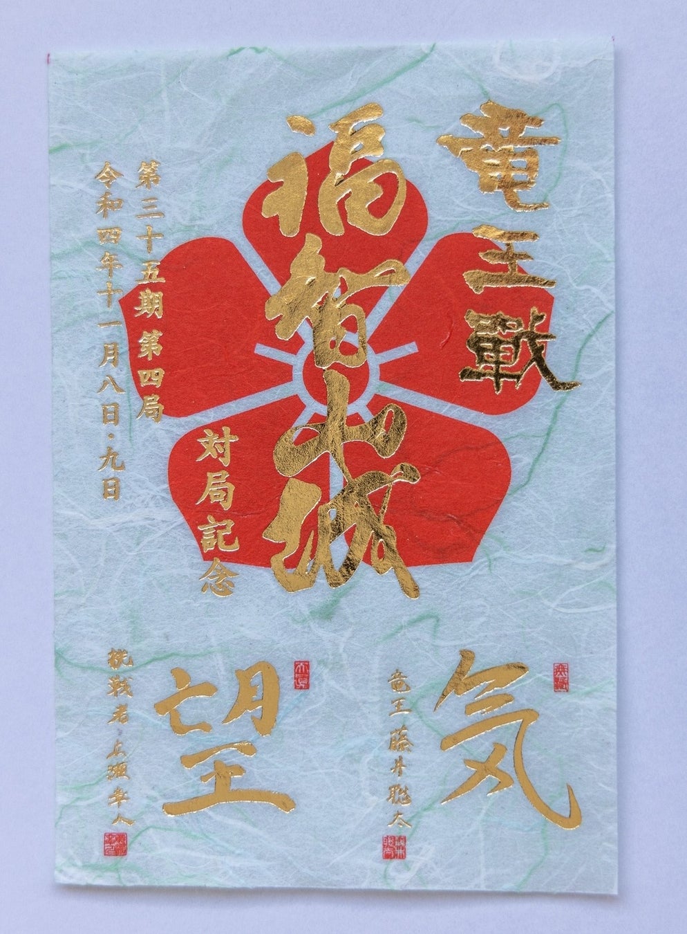 竜王戦福知山城対局の記念グッズ「御城印」完成!「竜王戦福知山城対局記念 限定御城印」手漉き丹後和紙「雲竜紙」に、竜王戦ロゴと対局者の藤井竜王・広瀬八段の揮毫を金箔であしらったプレミアムな一枚