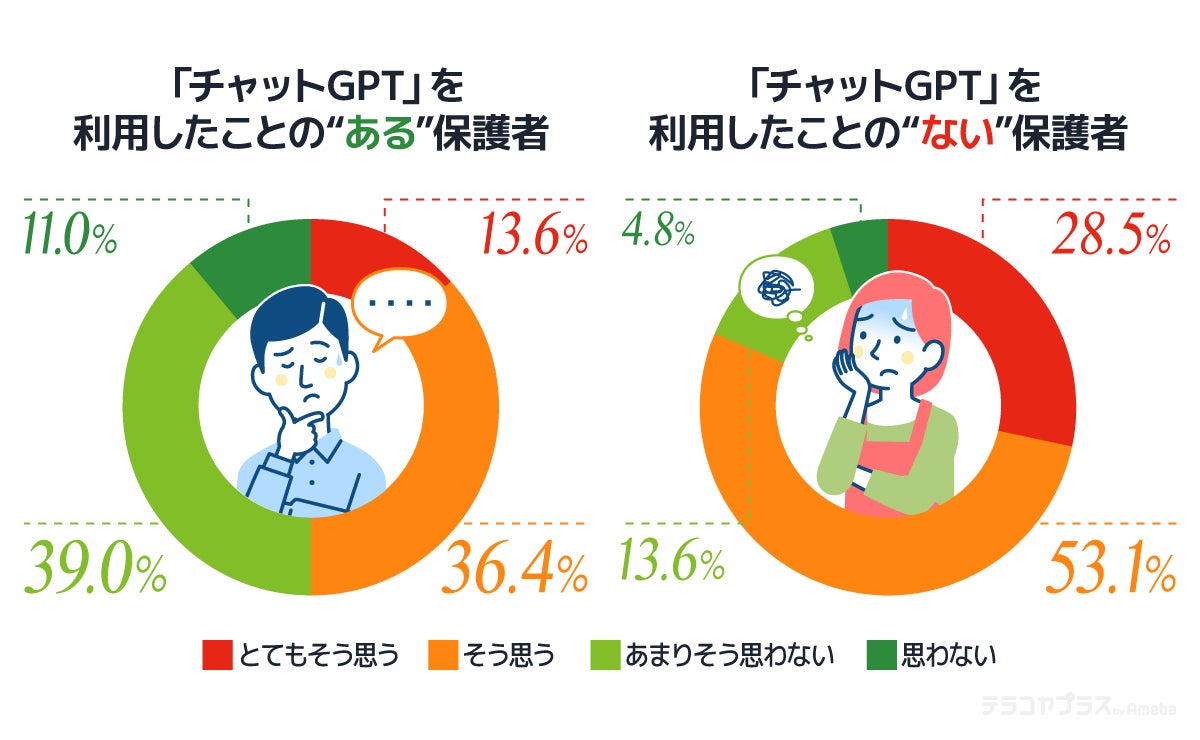 しかし、チャットGPTを利用したことの“ある”保護者と“ない”保護者で分けると、利用経験の“ない”保護者は「とてもそう思う」(28.5%)「そう思う」(53.1%)を合わせて約8割(81.6%)となりましたが、利用経験の“ある”保護者で規制などが必要と考えている保護者は合わせて半数の50%でした。