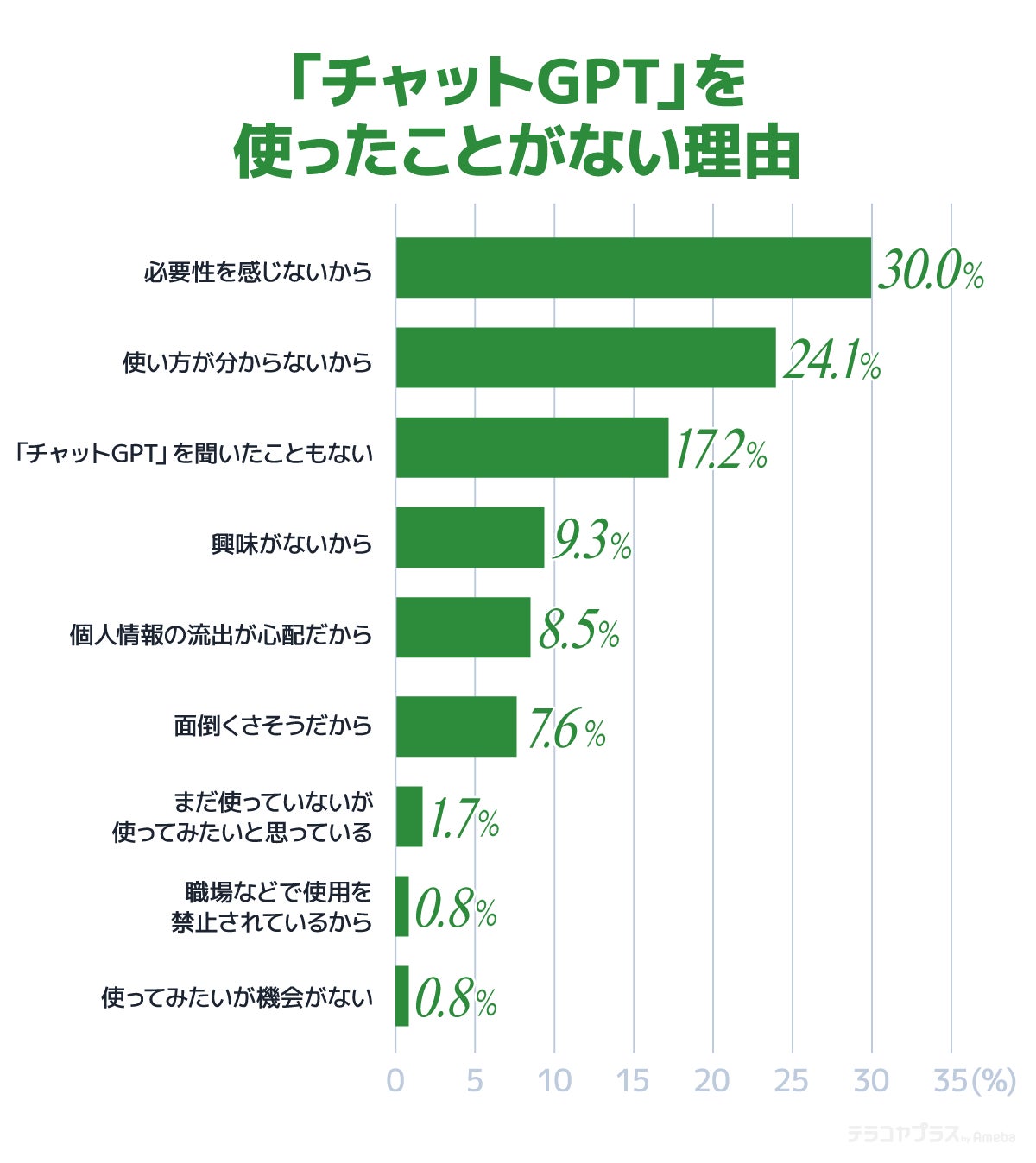 「必要性を感じない」がもっとも多く約3割(30.0%)、続いて「使い方が分からないから」(24.1%)。「チャットGPTを聞いたことがない」という保護者が約2割(17.2%)もいることも明らかになりました。