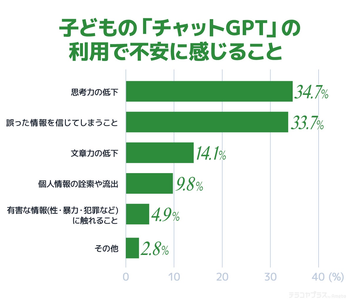 また、どのような点に不安を抱いているのか尋ねたところ、「思考力の低下」や「誤った情報を信じてしまうこと」への懸念を挙げる保護者が多くいました。