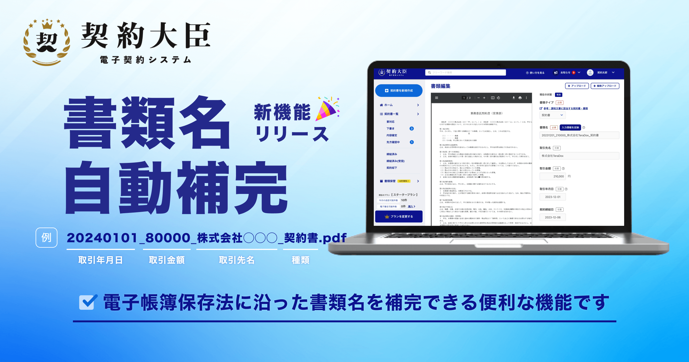 株式会社TeraDox(本社:東京都新宿区、代表取締役:齋藤 啓司)は、電子契約サービス『契約大臣』にて、書類名自動補完機能の提供を開始したことをお知らせいたします。