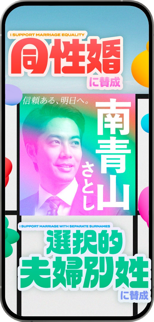 「同性婚に賛成」「選択的夫婦別姓に賛成」という立体的な文字のエフェクトがポスター周辺に現れることで、それぞれ法制化に賛成するかどうかを一目で知ることができます。なお、候補者が法制化に賛成しているかの判別については、国会議員への大規模調査に基づいて同性婚の意向を可視化したウェブサイト「マリフォー国会メーター」などの情報を基準にしています。