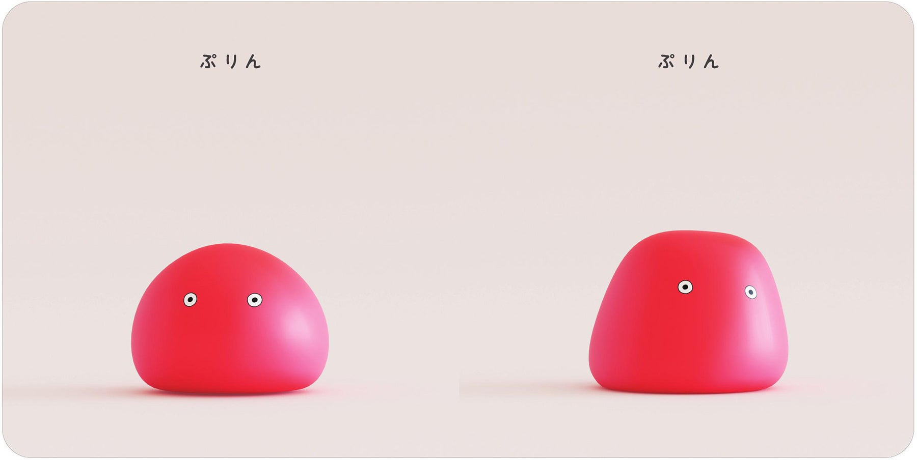立体的に見えるぷりんぽよんは、実物を撮影したものではなく、すべてパソコン上で制作した3DCGのデータによって表現されています。CGアーティストならではの感覚と視点から生まれた、これまでにない質感と動きを、絵本というかたちで体験できる一冊です。