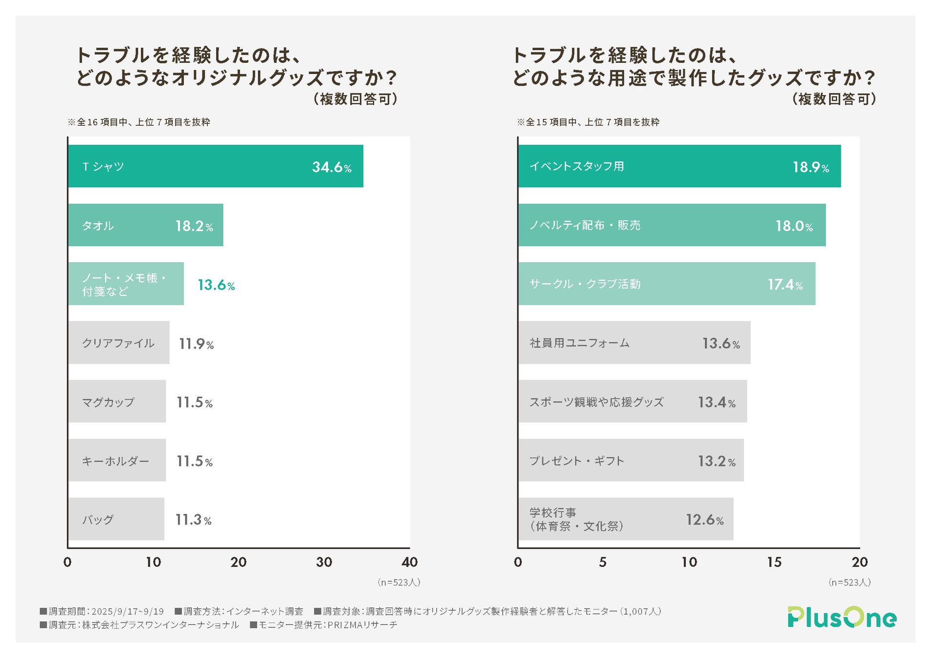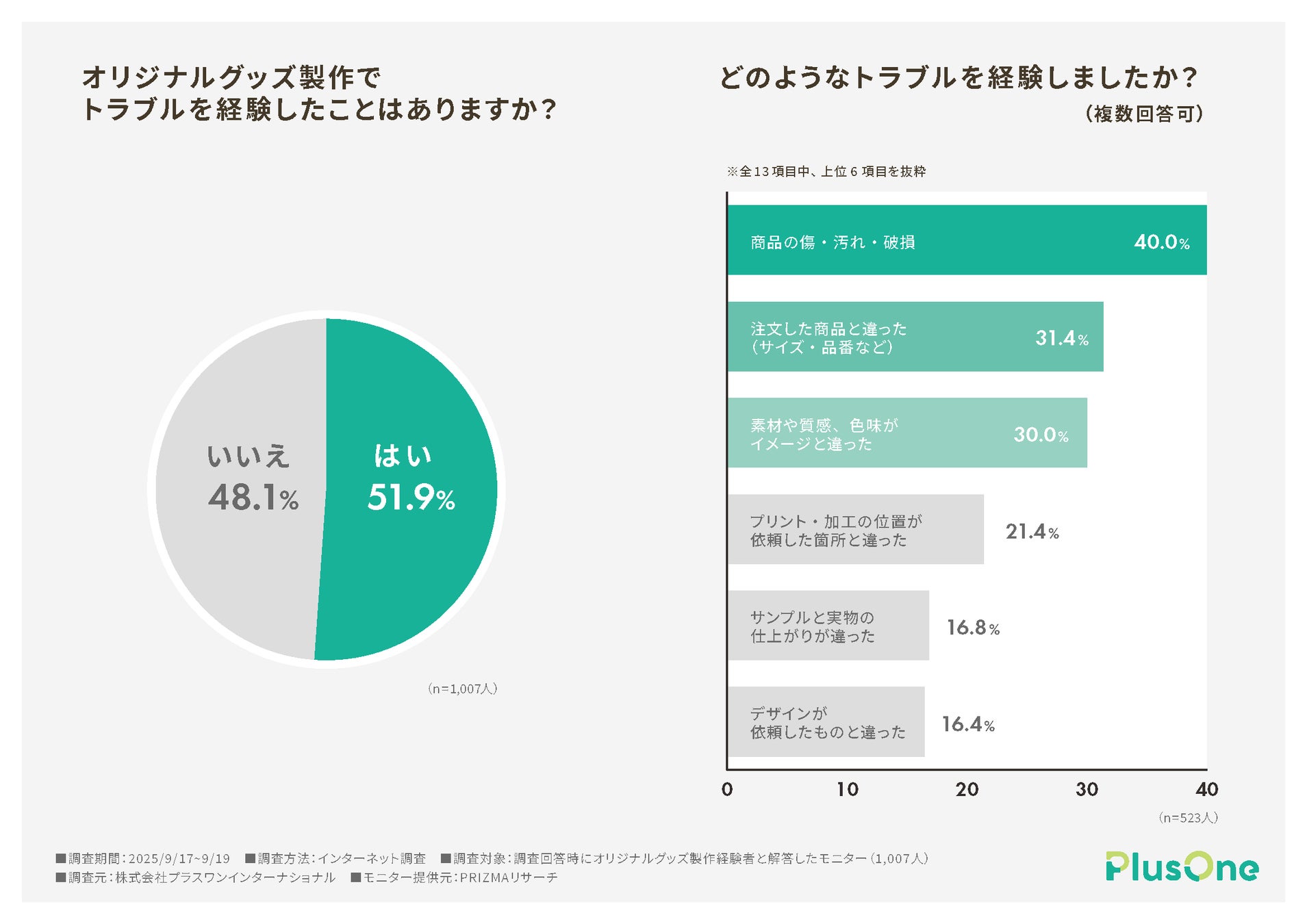 オリジナルウェア・グッズの製造販売を行う株式会社プラスワンインターナショナル(本社:香川県高松市、代表取締役:新開強、以下プラスワン)は、オリジナルグッズ製作経験者を対象に、「オリジナルグッズのトラブル」に関する調査を実施しました。