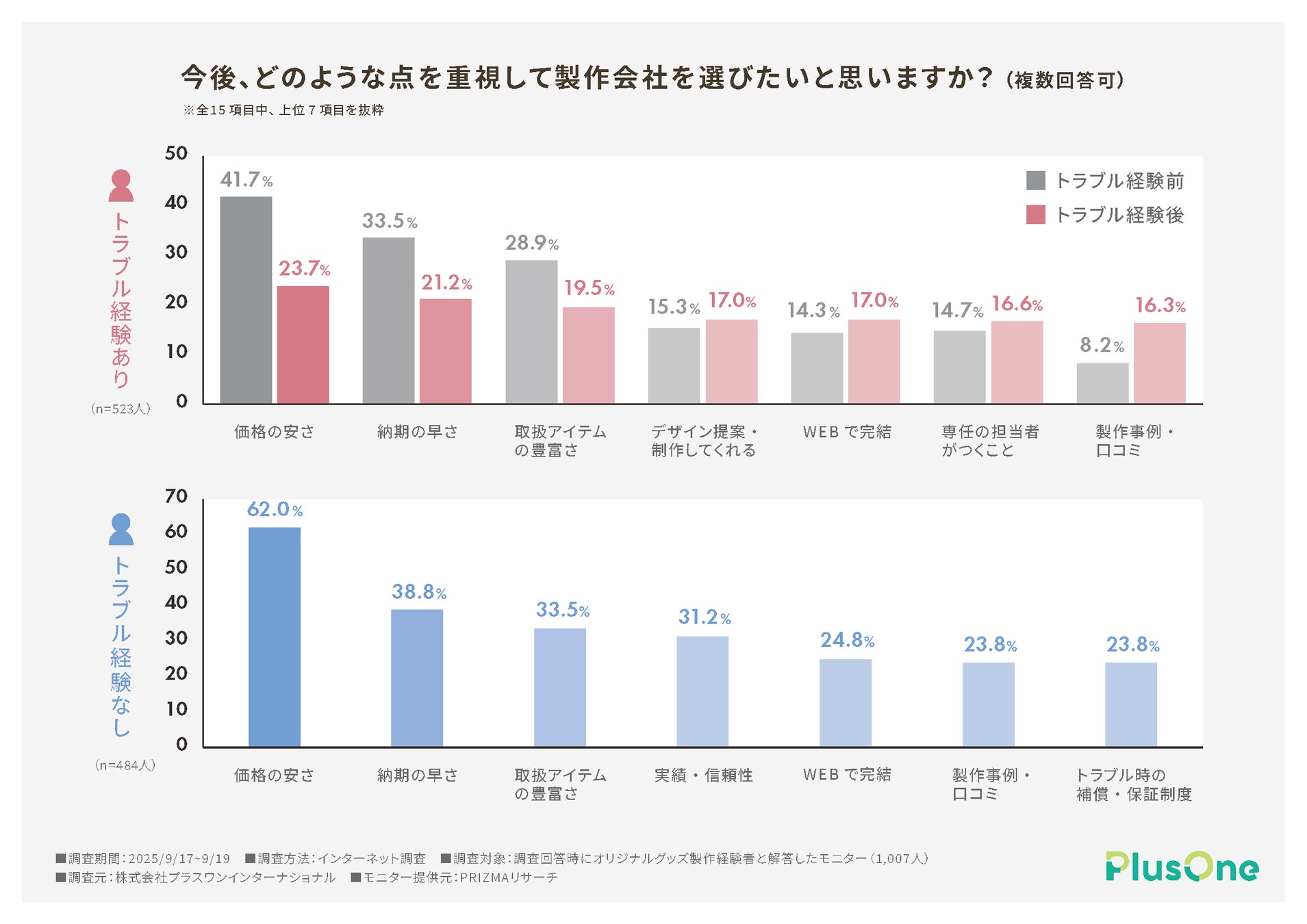 最後に、「今後、どのような点を重視して製作会社を選びたいと思いますか?(複数選択可)」と質問したところ、トラブル経験の有無に関わらず『価格の安さ』『納期の早さ』『取り扱いアイテムの豊富さ』が上位に挙がりました。