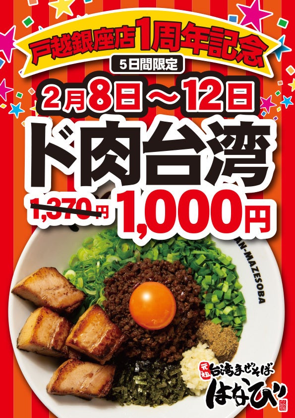 【ド肉!】台湾まぜそばを特別価格でご提供!おかげさまで、台湾まぜそば専門店「麵屋はなび」戸越銀座店が1周年を迎えました。5日間限定の販売になります。
