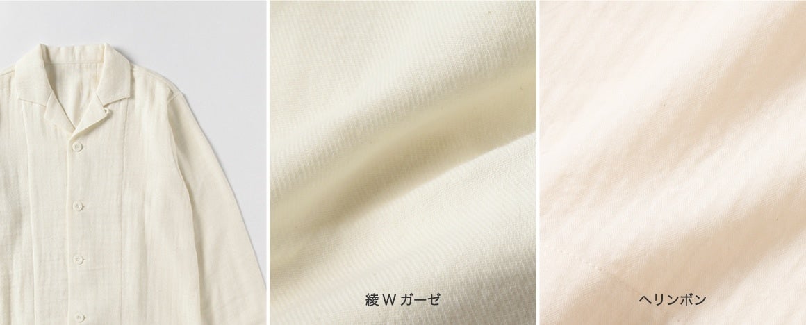 2重構造のガーゼ素材。ふんわり空気を含みあたたかく、肌になじむ綾織独特のとろんとした風合いで、洗うほどにふくふくと、やわらかくなる素材です。織機の織りスピードを低速にし、ゆっくりとゆっくりと織っています。綾組織のガーゼだからこそ生まれる光沢感としなやかさが人気の秘訣です。