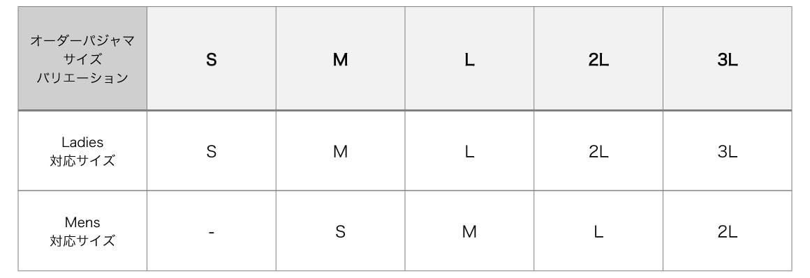 通常商品では、レディースのMサイズ、メンズのM、Lサイズのみの展開となります。 オーダーパジャマでは、レディースのSサイズから、メンズサイズの2L相当のサイズまで展開しております。