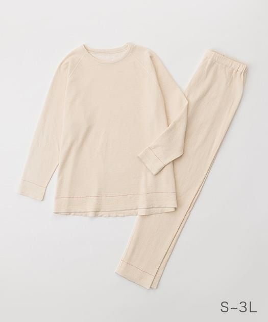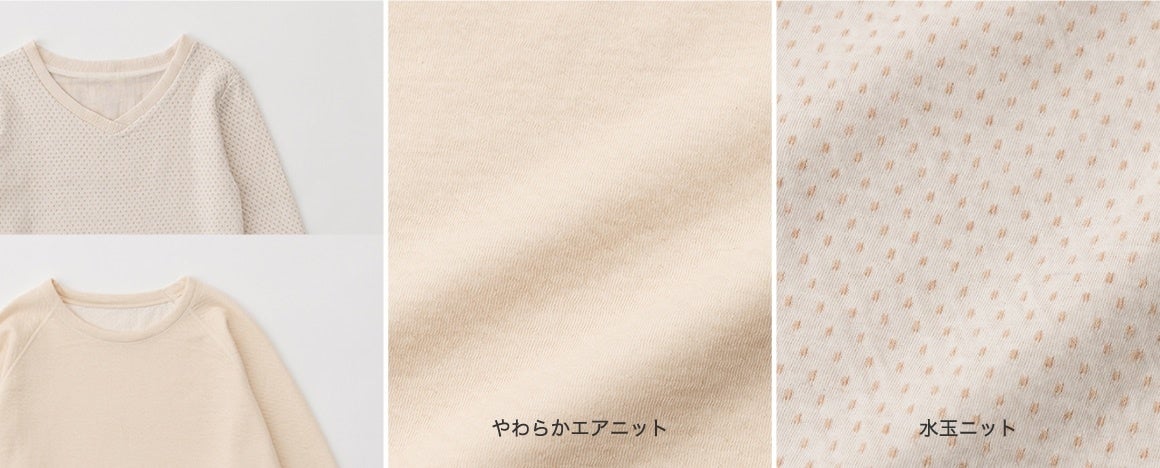 2つの天竺の生地を重ね合わせ、ひとつの生地にする接結天竺という作りで、生地のあいだに空気が入っているイメージから「エアニット」と呼ばれています。しっとりとした肌触りで、袖を通した瞬間、気持ちよさが広がります。パジャマのため!とも言えるくらいの、プリスティン自慢の生地です。