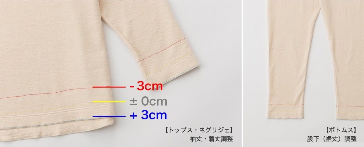 トップスの袖丈や着丈、パンツ丈の長さを3cm間隔で調整できます。 各商品ページで紹介している写真の赤い線は-3cmで作った場合の丈イメージです。