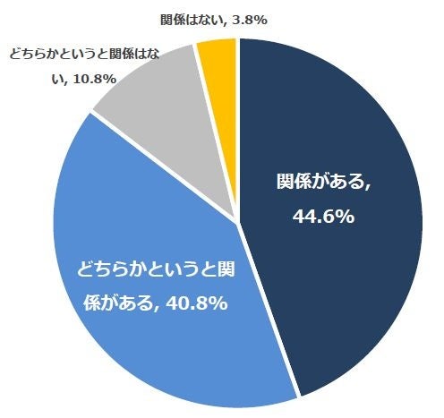 オーガニックコットンのパジャマを着用した経験が「ある」と回答した方130名を対象に、オーガニックコットンパジャマと睡眠の質に関係があると思うか質問したところ、85.4%が「関係がある」(関係がある:44.6%、どちらかというと関係がある:40.8%)と回答しました。