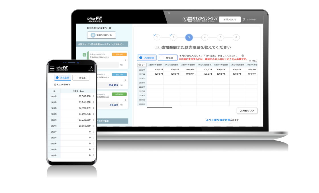 パソコンやスマホから所有の太陽発電所の資産価値を把握できる「afterFIT太陽光発電所査定」は、機能を拡充し実際の発電量または売電収入額を入力することで、より精度高く査定額が算出できます。
