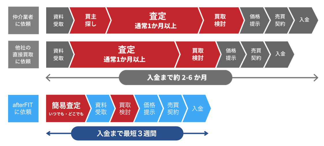 「aterFIT太陽光発電所査定」機能は、発電事業者にとって課題となる売却までのスピードを大幅に短縮できます。もし、査定価格にご納得いただき売却を希望される場合は、全国24カ所にあるafterFITの支店から担当者が最短で当日に現地調査に出向き、発電所の現況を反映した最終買取価格を提示します。査定から現地調査までの期間を大幅に短縮できるので、通常、入金まで2~6カ月かかるところ、最短3週間で現金化します。
