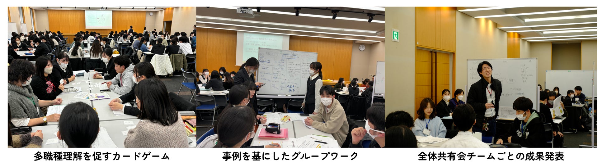 「他職種がどう介入するかを学べたのが新鮮で面白かった」「現場の具体的なイメージが湧き、自分の専門性を再確認できた」「多様な専門性を持つ学生と協力することで、チームで働く大切さを実感した」など前向きな回答が多く、アンケートでも、参加者の85%が「多職種連携の重要性を実感した」と回答しており、本授業が学生の成長に寄与したことが分かります。