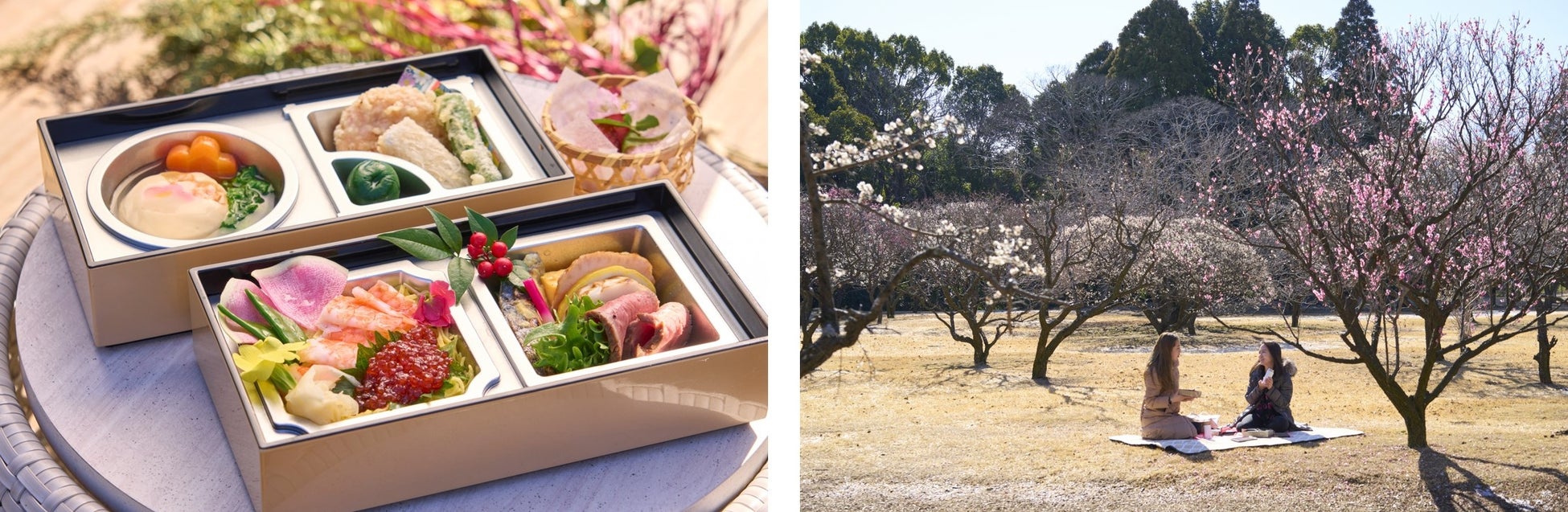『Sport & Do Resort リソルの森』の施設内にある梅園では、約7,000坪の広い空間に、蝋梅、紅梅、しだれ梅、豊後梅、白加賀梅、野梅、緑縁梅など、約450本の梅の木が立ち並び、毎年1月下旬ごろ開花し、2月中旬から3月上旬にかけて見ごろを迎えます。そんな梅園でのお花見ピクニックをより気軽に楽しんでいただけるようにと、「翠州亭」では2022年より「梅のピクニックBOX」を販売。筍や菜花、春を告げる鰆など、春の彩り豊かな食材をふんだんに使用し、見た目にも心がうらかかになる特別な梅見弁当となっています。