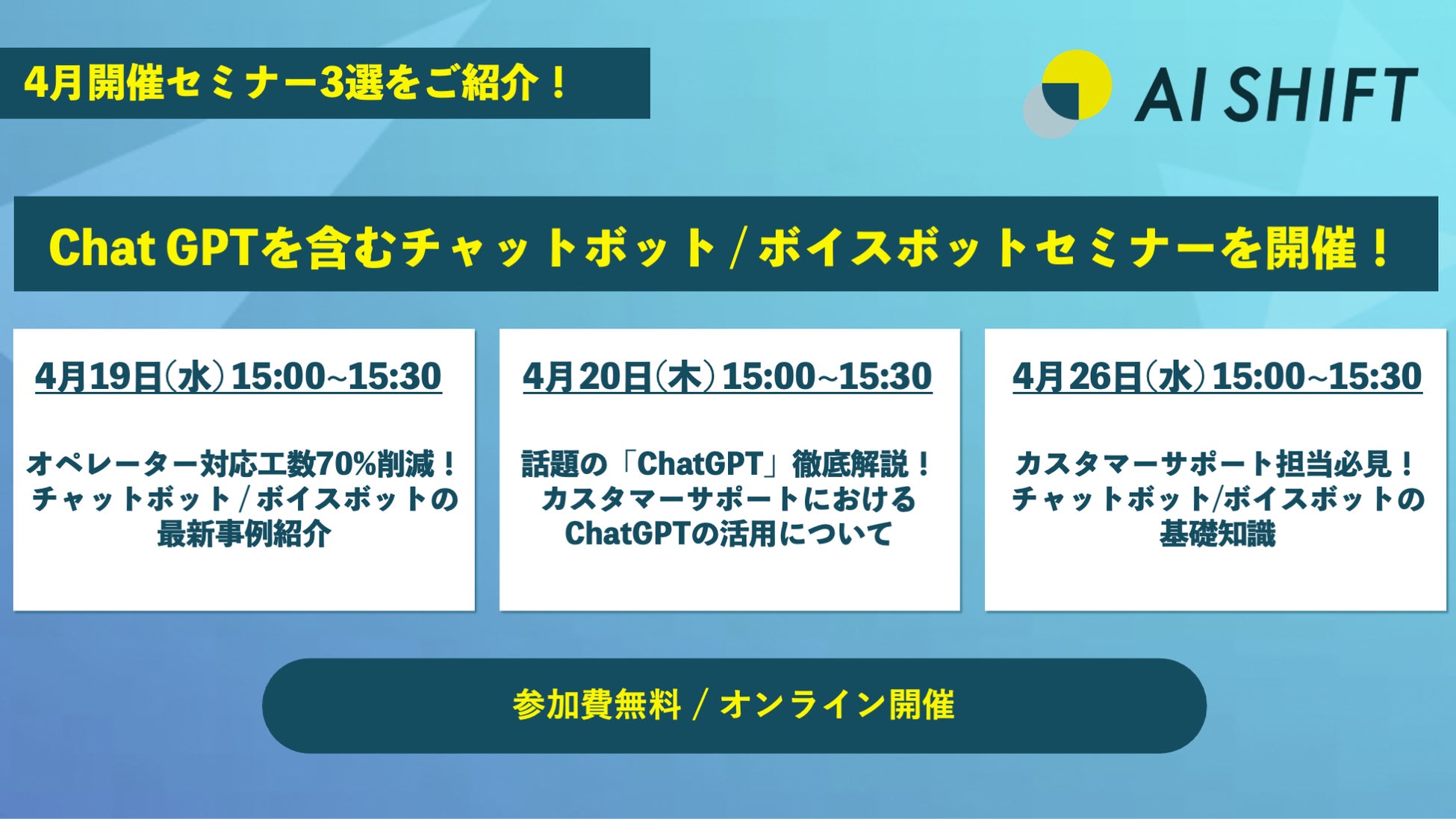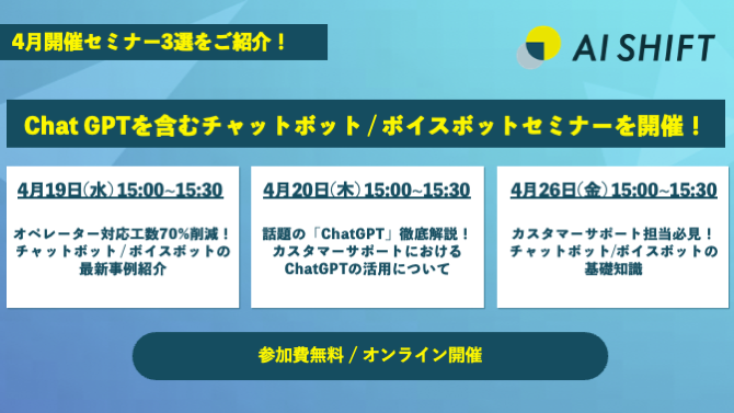 | 日時 | ①【オペレーター対応工数70%削減!】チャットボット / ボイスボットの最新事例紹介 4月19日(水) 15:00~15:30 ②話題の「ChatGPT」徹底解説!カスタマーサポートにおけるChatGPTの活用について 4月20日(木) 15:00~15:30 ③カスタマーサポート担当必見!チャットボット / ボイスボットの基礎知識について 4月26日(水) 15:00~16:00 |