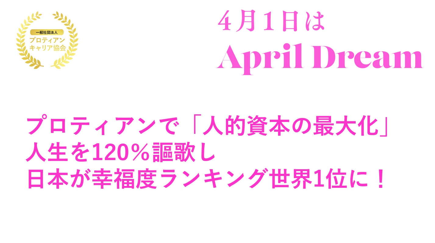 一般社団法人プロティアン・キャリア協会 (本社:東京都新宿区、代表理事:田中研之輔・有山徹、以下、「当協会」)は、「April Dream 4 月 1 日は、夢の日。」に参加しています。このプレスリリースは、当協会の April Dream です。 私たちは現代版プロティアンキャリアを拡げたことで日本企業の「人的資本の最大化」を推進し、人生を120%謳歌する人が増え、日本が幸福度ランキングで世界1位になったことをお伝えいたします。