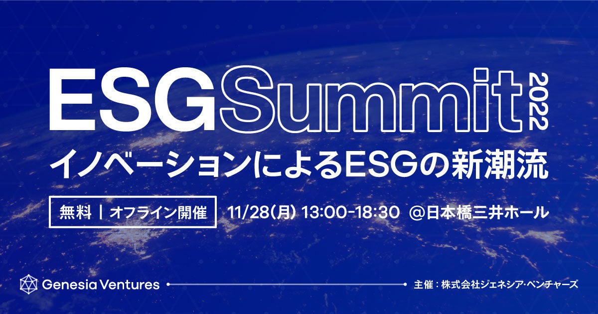 株式会社ジェネシア・ベンチャーズ(代表取締役:田島 聡一、本社:東京都港区)は、来たる2022年11月28日(月)にオフラインイベント「ESG Summit 2022~イノベーションによるESGの新潮流~」(以下:ESG Summit 2022)を開催いたします。