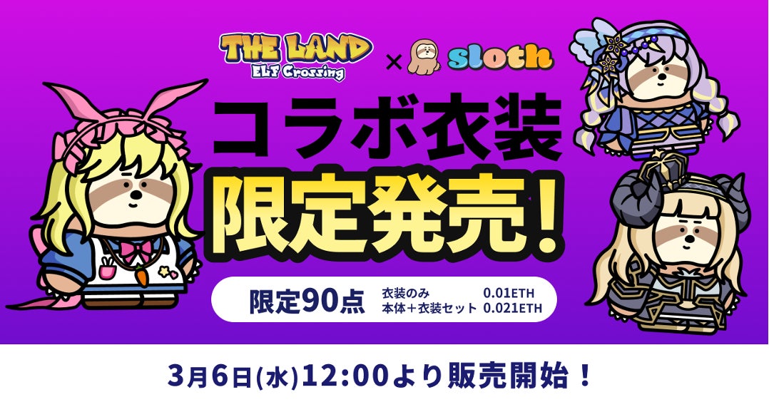 きせかえできる NFT「sloth」とメタバース型ファーミングブロックチェーンゲーム「THE LAND」がコラボした特別な NFT を、3 月 6 日(水)12:00 より、sloth コラボ衣装販売サイト内にて販売を開始いたします。販売する NFT は、本体のほか、服、ガジェット、フードなど「THE LAND」をモチーフにした限定のデザインとなっており、各 NFT を購入することで、かわいらしいslothをきせかえすることが可能となります。