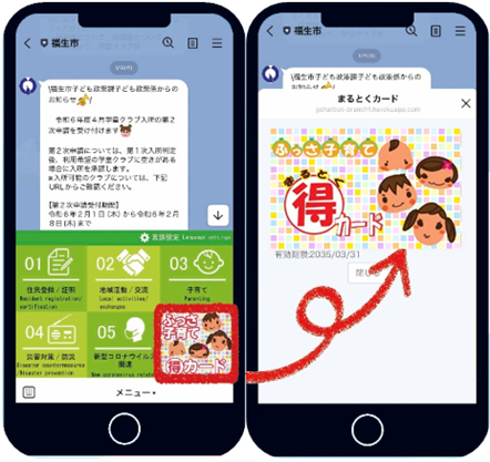 子育て世帯の市民は、スマートフォンなどから「福生市LINE公式アカウント」を友だち追加後、住所や氏名などの必要事項を入力し、LINE上に表示された電子会員カードを協賛店にて提示することで、協賛店が提供する割引などの特典を受けることができます。また、当社にて作成した「ふっさ子育てまるとくカード」専用Webサイトにて、キーワードやマップから協賛店を検索して店舗情報を確認することもできます。